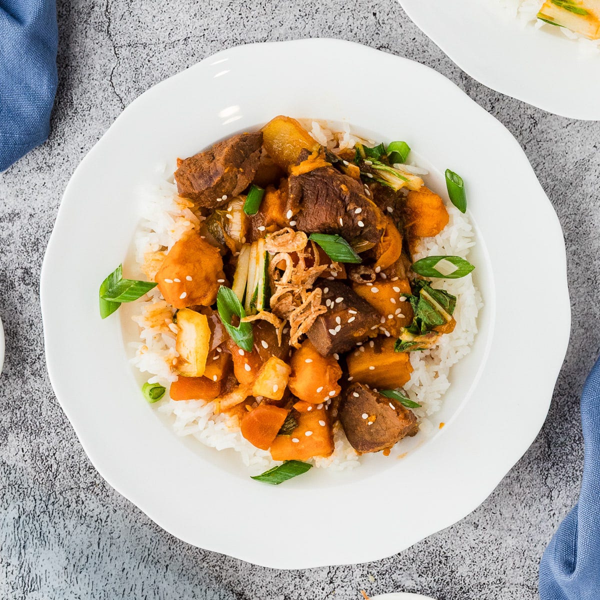 Spoon this over a bowl of fluffy white rice, cauliflower rice, or quinoa. Top it however you like—I’m partial to a fried egg and some crispy shallots, but green onions and sesame seeds are classic for good reason.