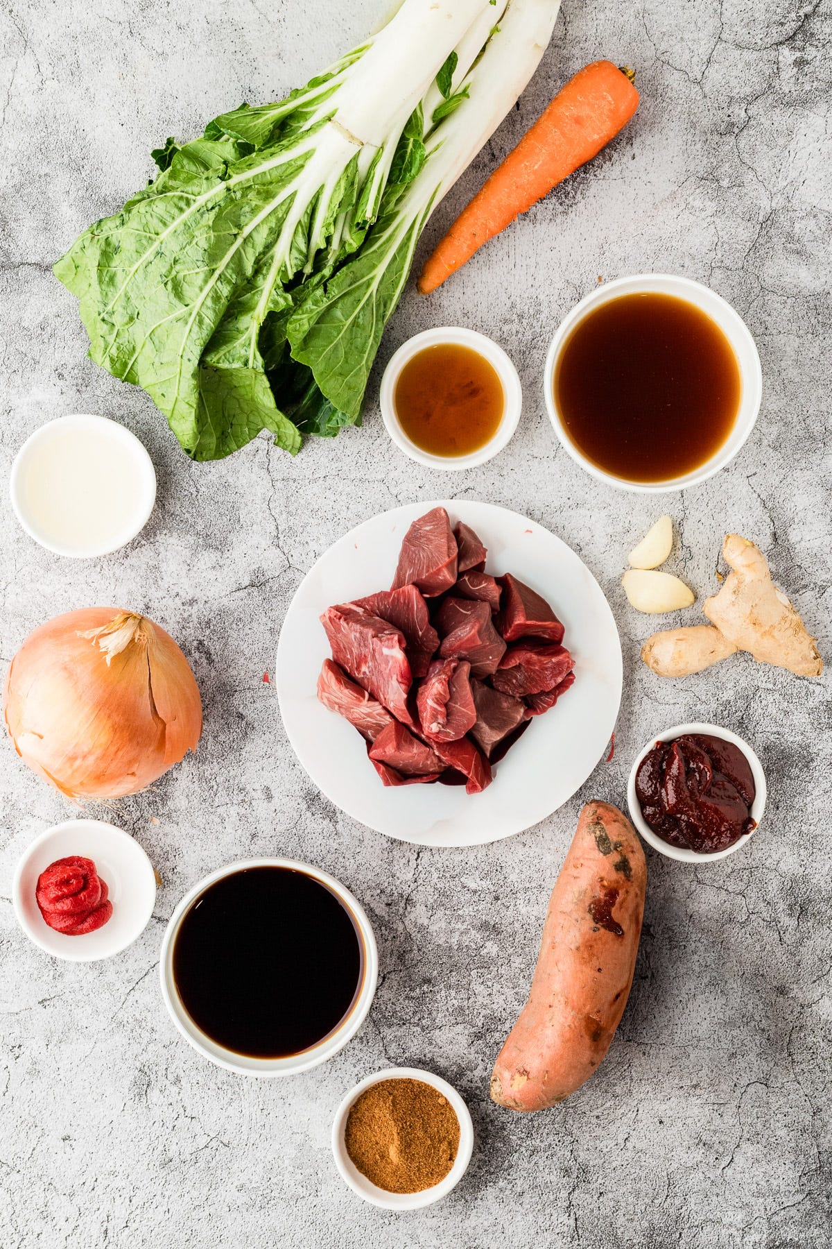 - Place the beef at the bottom of the crock pot. Layer sweet potatoes, carrots, onion, garlic, and ginger on top