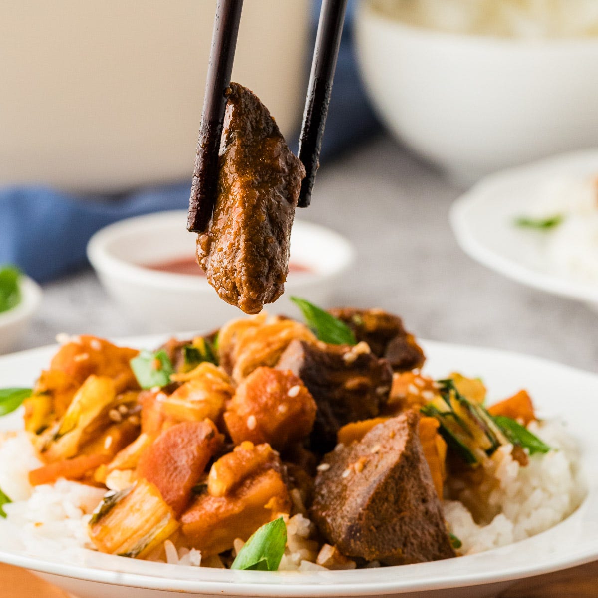 I love using my smaller 2-quart slow cooker for recipes like this. It’s just the right size for 2 servings for dinner tonight and maybe lunch tomorrow, without feeling like you’re eating the same thing for a week straight. The beauty of slow cooking is how it transforms inexpensive cuts like chuck roast or stew meat into something tender and rich, while the sauce is built on gochujang, soy sauce, and just a hint of sweetness.